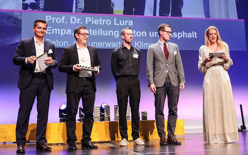 Michael Fritsche von der Ziegelindustrie Schweiz und Award-Sponsor, Pietro Lura, Daniel Grossegger und Mateusz Wyrzykowski von der Empa sowie Moderatorin Christa Rigozzi (v.l.n.r). Foto: Building Award 2025