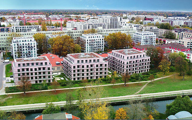Neuer Wohnraum auf ehemaligem Industrieareal: Von Ein-Zimmer-Wohnungen über Townhouses bis hin zu Co-Living-Apartments – im fertigen Havelufer Quartier leben bis zu 4’000 Menschen. Foto: Drees & Sommer
